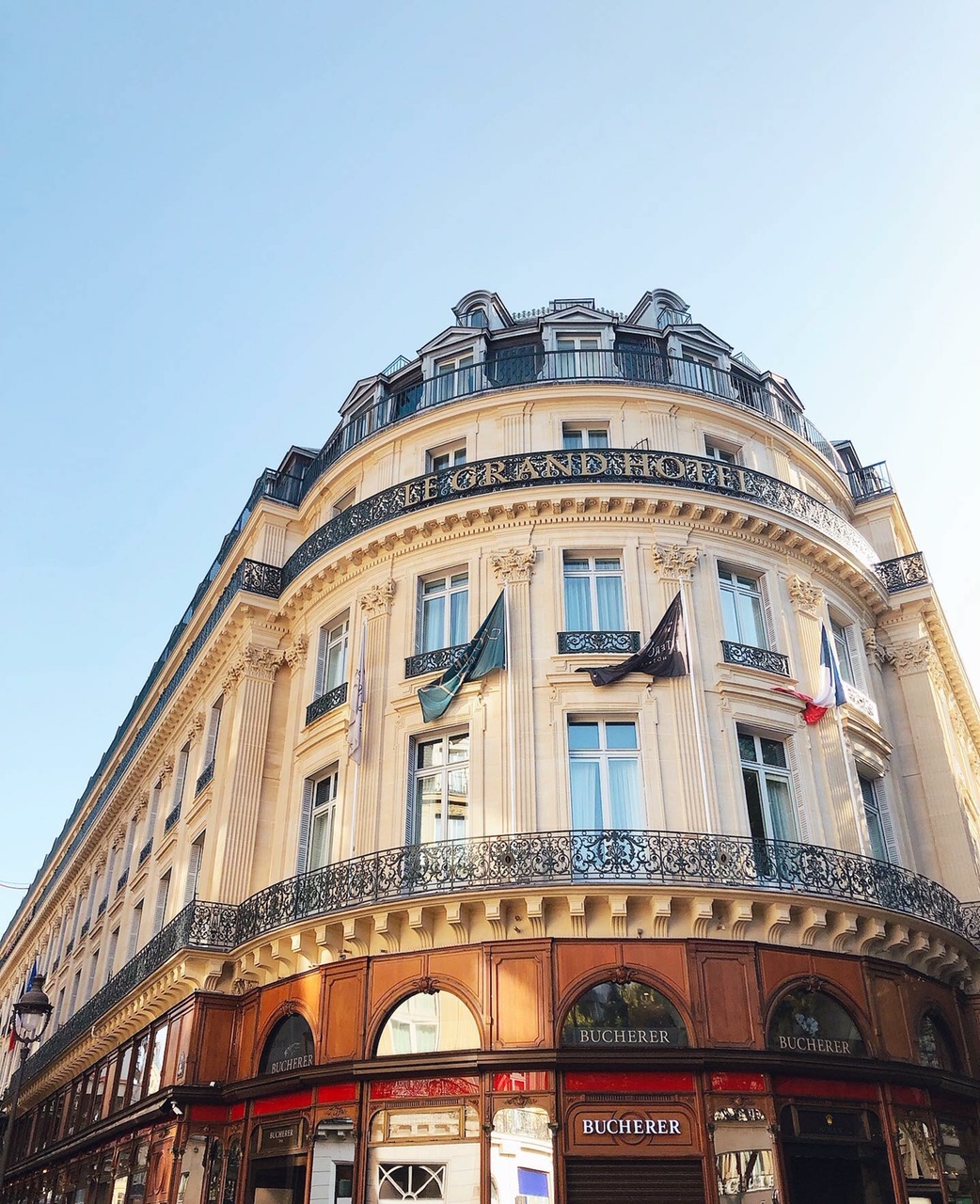 ル・グランホテルの重厚なロゴが、快晴の秋空に光ります。改修を終えたファサードは、オペラ地区のランドマークとして更に存在感を増しています。