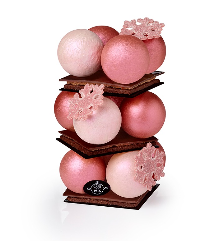 カフェデゥラペでチーフパティシエを務めるソフィーベルナルディのモットーは、見た目が優美で遊び心溢れるお菓子を作ること。今年は、クリスマスバブルを重ねた驚きいっぱいのブッシュドノエルを創りました。ショコラのサブレ、クリスピーなベリー、ゴジベリーのチョコレート包み、エグランティーヌ入りのヴァニラムース、ヴァニラシロップに浸したスポンジケーキの隠れたバブルなどが積み重ねられています。ピンク色のカカオ豆が、自然なピンクで可愛いバブルたちを贅沢にコーティングしています。