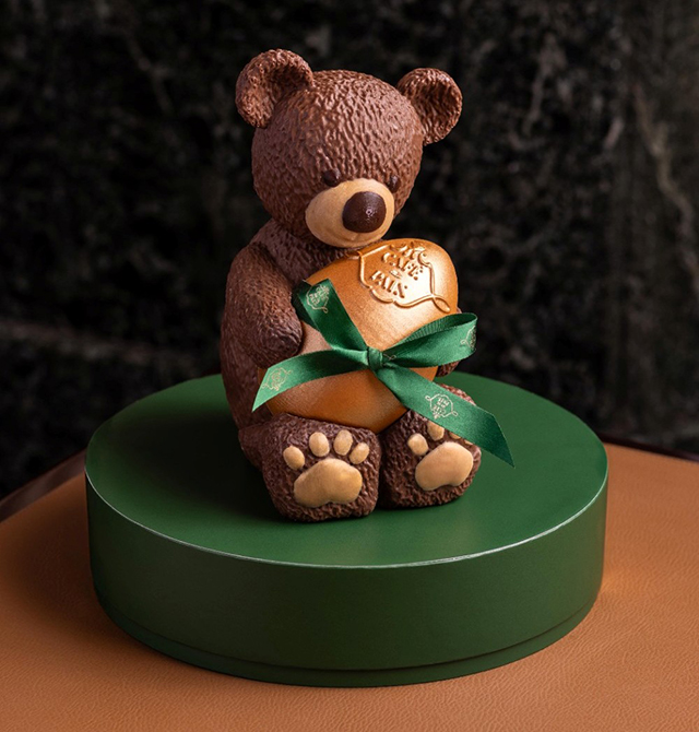 ミルクチョコレートとブロンド・ドゥルセー・チョコレートで作られたテディベアはおとぎ話の世界からやってきたようです。テディベアの下には3種類のチョコレート、ブロンド・ドゥルセー、ダークチョコレート、ホワイトチョコレートで作られたサクサクのマーブルが隠されています。丸太の形をした土台の上には、クリーミーなオーガニック・マダガスカル産バニラ・ムースとバニラ・ビスケット、カリッと焼いたピーカン・フィユヤンティーヌの層、ピーカン・クリーム、そして塩バター・キャラメルが敷かれています。クリスマスのお祝いにぴったりのビュッシュドノエルです。